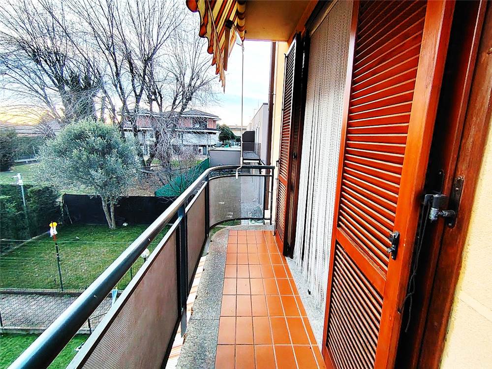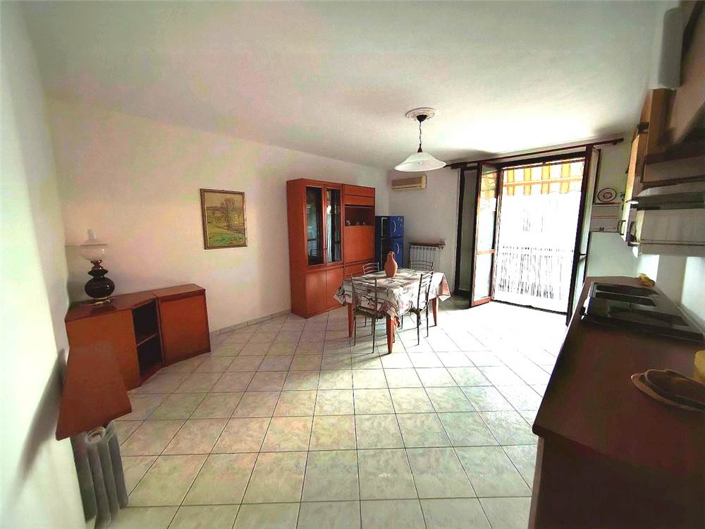 Living da sogno: Un soggiorno con cucina a vista inondato di sole, che si apre su un balcone pronto per i tuoi caffè all'aperto con vista aperta sul verde.